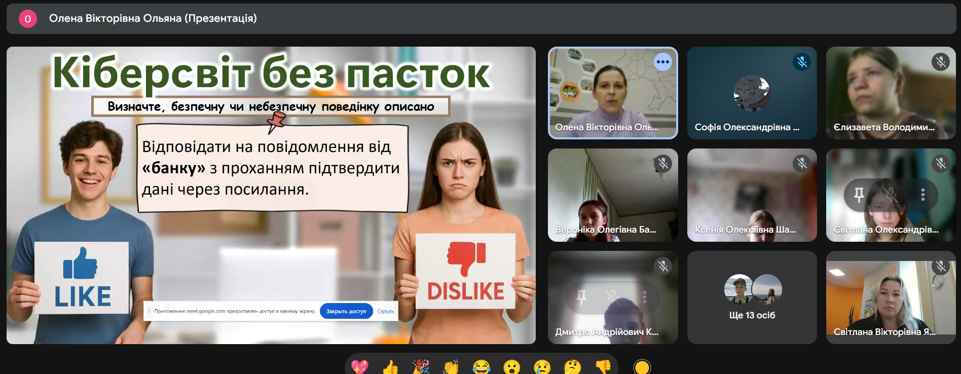 Соціальний педагог Новгоро-Сіверського ліцею №1 Олена ОЛЬЯНА та класний керівник Юлія ПІВНЮК під час інтерактивної зустрічі "Твоя цифрова броня. Кібербезпека: правила життя онлайн" нагадали учням 8-А класу, що таке кібербезпека, разом визначили безпечні та небезпечні поведінки в інтернеті, розглянули приклади фейків і навчилися їх розпізнавати.